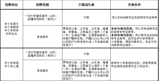 共招聘中小學(xué)事業(yè)編制教師83名。其中,初中語(yǔ)文7名、初中數(shù)學(xué)3名、初中英語(yǔ)3名、初中科學(xué)4名、初中社會(huì)11名、初中心理2名、小學(xué)語(yǔ)文①14名、小學(xué)語(yǔ)文②15名、小學(xué)數(shù)學(xué)15名、小學(xué)英語(yǔ)5名、小學(xué)科學(xué)3名、小學(xué)心理1名。具體招聘學(xué)校和招聘指標(biāo)數(shù)詳見(jiàn)《寧波市海曙區(qū)教育局公開(kāi)招聘2022學(xué)年事業(yè)編制中小學(xué)教師(第一批)招聘需求表》(附件1)。