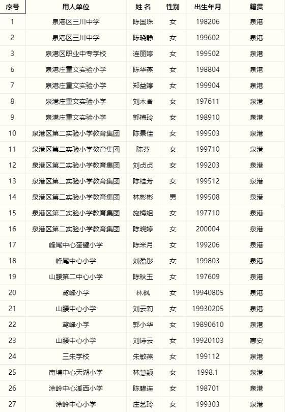 根據《2021年泉州市泉港區(qū)公辦學校公開招聘編外合同教師公告》和學校招聘編外合同教師有關公告,經報名、資格復審、面試、體檢和考察等工作程序,現(xiàn)將擬聘用人員名單公示如下: