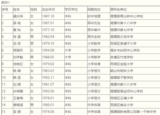 據(jù)《湘潭大學(xué)附屬實(shí)驗(yàn)學(xué)校面向全市中小學(xué)公開選調(diào)優(yōu)秀教師公告》及有關(guān)規(guī)定,經(jīng)報(bào)名、筆試、資格審查、面試、體檢、考察等程序,確定龔水英等15名同志為湘潭大學(xué)附屬實(shí)驗(yàn)學(xué)校面向全市中小學(xué)公開選調(diào)優(yōu)秀教師擬聘用人選(見附件1),現(xiàn)予以公示。
