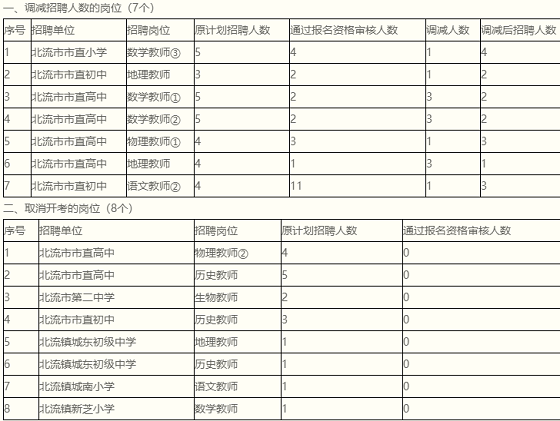 2021年下半年北流市公開招聘中小學(xué)教師報(bào)名工作已結(jié)束,因部分招聘崗位的報(bào)考人數(shù)達(dá)不到開考比例要求或無(wú)人報(bào)考,根據(jù)《2021年下半年北流市公開招聘中小學(xué)教師公告》的有關(guān)規(guī)定,現(xiàn)將調(diào)減崗位招聘計(jì)劃和取消開考崗位公告如下: