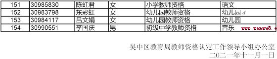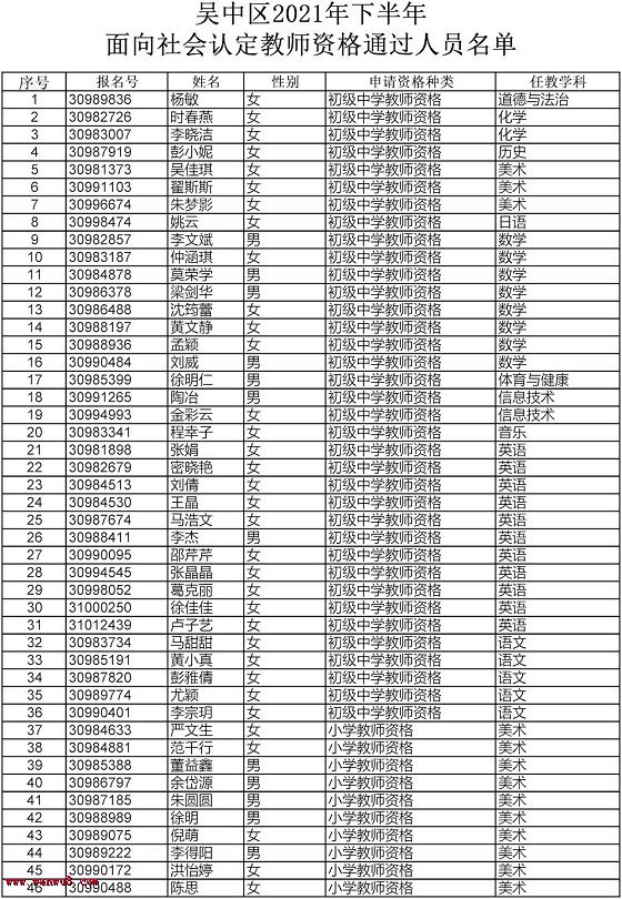 根據(jù)省、市教師資格認(rèn)定工作的要求,按照網(wǎng)上申請(qǐng)、體格檢查、現(xiàn)場(chǎng)確認(rèn)、犯罪記錄核查等相關(guān)程序,經(jīng)教師資格專家審查委員會(huì)審定,154人通過資格認(rèn)定,F(xiàn)將認(rèn)定結(jié)果予以公示(見附件),公示時(shí)間為2021年11月2日至11月8日。如有異議,請(qǐng)?jiān)诠酒趦?nèi)向蘇州市吳中區(qū)教育局人事科反映,聯(lián)系電話:67081181。