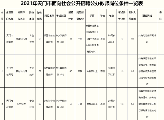 附件:1、2021年天門市面向社會(huì)公開招聘公辦教師崗位條件一覽表