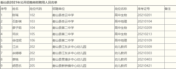 附件:衡山縣2021年公開招聘教師擬聘用人員名單