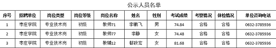根據(jù)《關(guān)于做好2021年事業(yè)單位公開(kāi)招聘工作人員有關(guān)問(wèn)題的通知》(魯人社字〔2020〕155號(hào))等相關(guān)規(guī)定,按照崗位招聘計(jì)劃,棗莊學(xué)院組織完成了公開(kāi)招聘考試、考察、體檢等工作,將對(duì)擬聘用人員進(jìn)行分批公示,現(xiàn)將第二批擬聘用人員名單公示如下。公示期為7個(gè)工作日,自2021年11月18日至2021年11月26日(不含節(jié)假日)。公示期間,如對(duì)公示人選有異議,請(qǐng)及時(shí)向省事業(yè)單位公開(kāi)招聘主管機(jī)關(guān)和棗莊學(xué)院反映。