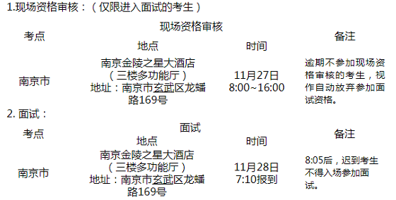 現(xiàn)將11月27日~28日南京市考點(diǎn)現(xiàn)場(chǎng)資格審核、面試等工作公告如下(其他批次另行公告)。