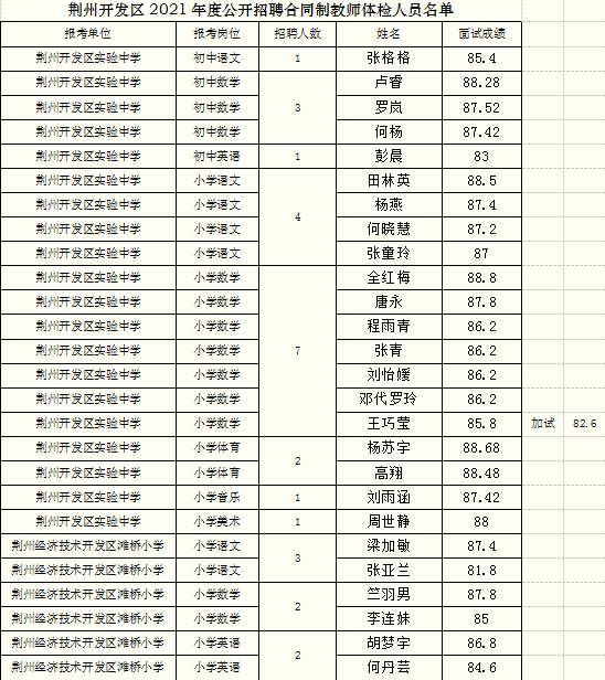 根據(jù)《荊州開(kāi)發(fā)區(qū)2021年度公開(kāi)招聘合同制教師公告》,現(xiàn)就荊州開(kāi)發(fā)區(qū)2021年度公開(kāi)招聘合同制教師面試成績(jī)和考生體檢有關(guān)事項(xiàng)公告如下: