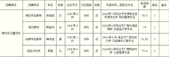 根據(jù)《柳州市交通學(xué)校2021年度公開招聘聘用控制數(shù)工作人員公告》要求及安排,張致韻等同志經(jīng)考核、體檢合格,符合聘用條件。經(jīng)研究決定,擬聘用張致韻等同志為我單位工作人員,現(xiàn)予以公示,公示期5個(gè)工作日(2021年11月23日至2021年11月29日)。對(duì)擬聘用的同志如有異議,請(qǐng)以書面形式,并署真實(shí)姓名和聯(lián)系地址,于2021年11月30日前郵寄或直接送我單位(郵寄地址為:柳州市河西路25號(hào);郵編:545007,電話0772-2048969,2082011),群眾如實(shí)反映有關(guān)問(wèn)題受法律保護(hù)。