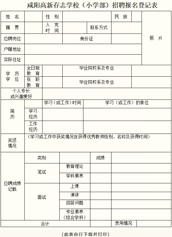 附件2:咸陽高新存志學校(小學部)招聘報名登記表