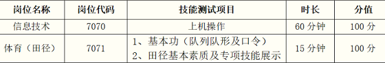 ②信息技術7070、體育(田徑)7071崗位考核由面試、試教、技能測試組成,其他崗位考核由面試、試教組成。面試、試教、技能測試滿分均為100分。面試、試教時長共10鐘,準備時長共40鐘。技能測試辦法見下表: