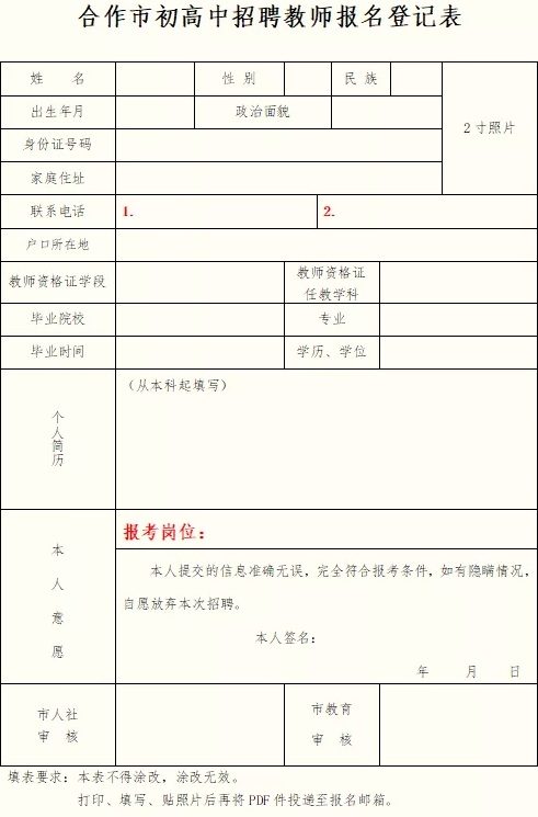 1.本次招聘采取網(wǎng)上報名的方式進行,不接受現(xiàn)場報名。網(wǎng)上報考人員將《合作市初高中招聘教師報名登記表》、近期白底正面免冠證件照片1張,身份證(正反兩面)、戶口簿(蓋章首頁+本人頁)、畢業(yè)證、學(xué)位證、教育部學(xué)歷證書電子注冊備案表PDF、教師資格證(或教資國考合格證明+普通話等級證)、報到證(擇業(yè)證)原件掃描件在規(guī)定時限內(nèi)投遞到指定電子郵箱。