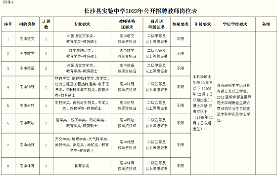 附件1:長沙縣實驗中學(xué)2022年公開招聘教師崗位表