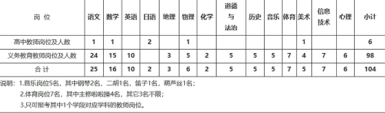 本次專場招聘語文、數(shù)學(xué)、英語、日語、地理、物理、化學(xué)、道德與法治、歷史、音樂、體育、美術(shù)、信息技術(shù)、心理等教師共104名;其中,高中教師6名,義務(wù)教育教師98名;具體專業(yè)及人數(shù)詳見下表: