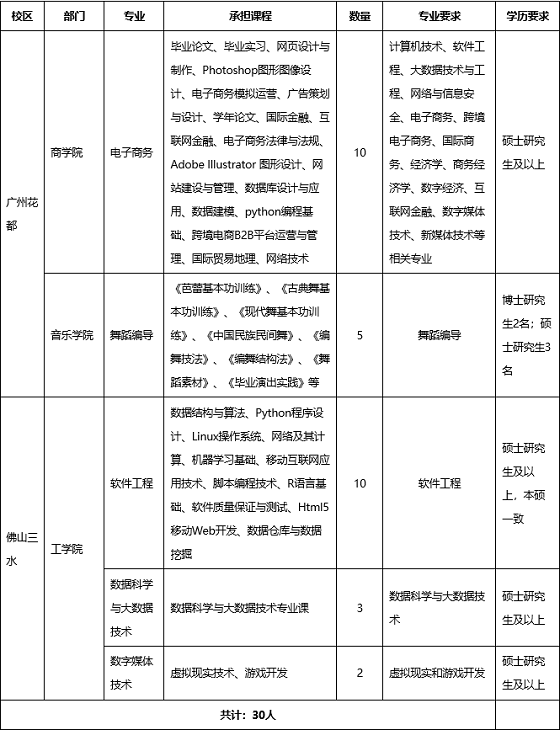 學(xué)校堅(jiān)持社會(huì)主義辦學(xué)方向,以建設(shè)高水平應(yīng)用型大學(xué)為目標(biāo),堅(jiān)持“正德厚生,勵(lì)志修能”校訓(xùn);堅(jiān)持“內(nèi)強(qiáng)素質(zhì)、外樹(shù)形象、和諧辦學(xué)、科學(xué)發(fā)展”的辦學(xué)方針;堅(jiān)持“以質(zhì)立校、以生為本、突出特色、崇尚創(chuàng)新”的辦學(xué)理念,深化教育教學(xué)改革,提高產(chǎn)學(xué)研綜合水平,全面推進(jìn)素質(zhì)教育,致力于培養(yǎng)德學(xué)兼?zhèn)、基礎(chǔ)扎實(shí)、技能嫻熟、具有創(chuàng)新創(chuàng)業(yè)精神、適應(yīng)地方和社會(huì)經(jīng)濟(jì)發(fā)展需要的應(yīng)用型人才。學(xué)校結(jié)合區(qū)域經(jīng)濟(jì)優(yōu)勢(shì)以及自身特點(diǎn),制訂應(yīng)用型本科專(zhuān)業(yè)人才培養(yǎng)方案,為本科教學(xué)工作提供人力、財(cái)力與物力保障,全面提升本科教學(xué)質(zhì)量?jī)?nèi)涵建設(shè)。學(xué)校連續(xù)10年被廣東省社會(huì)科學(xué)院競(jìng)爭(zhēng)力評(píng)估研究中心和廣東省省情調(diào)查研究中心聯(lián)合授予“廣東高等職業(yè)教育(民辦)競(jìng)爭(zhēng)力10強(qiáng)單位”稱(chēng)號(hào);2017年10月加入應(yīng)用技術(shù)大學(xué)(學(xué)院)聯(lián)盟;2018年1月、2021年3月,分別獲得第二屆、第四屆中國(guó)民辦教育百?gòu)?qiáng)單位榮譽(yù)稱(chēng)號(hào);2020年,學(xué)校被評(píng)選為廣東省民辦教育四十周年“突出貢獻(xiàn)機(jī)構(gòu)”;2021年3月,學(xué)校入選“2020廣州技術(shù)市場(chǎng)15強(qiáng)高!卑駟,是唯一入選的民辦高校;2021年4月,學(xué)校入選全國(guó)民辦本科院校競(jìng)爭(zhēng)力排行榜100強(qiáng)。應(yīng)學(xué)校事業(yè)發(fā)展需要,現(xiàn)招聘以下專(zhuān)業(yè)優(yōu)秀教師一批。
