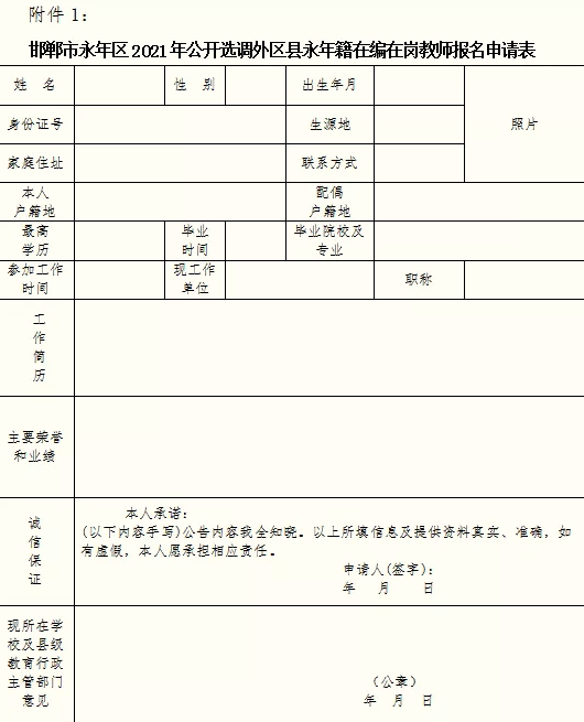 附件1:《邯鄲市永年區(qū)2021年公開選調(diào)外區(qū)縣永年籍在編在崗教師報(bào)名申請(qǐng)表》