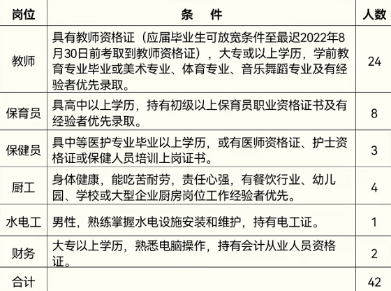 專任教師、財(cái)務(wù)人員、保健人員、保育員、廚工、電工等若干名。