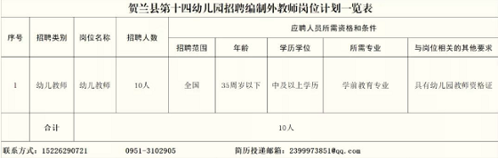 為不斷推進賀蘭縣幼兒園教育優(yōu)質發(fā)展,加強教師隊伍建設,經研究決定,現面向社會公開招聘非在編教師。現將有關事項公告如下: