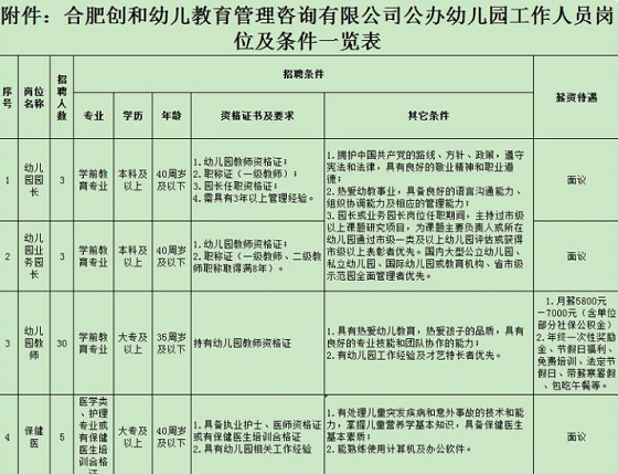 附件:合肥創(chuàng)和幼兒教育管理咨詢有限公司公辦幼兒園工作人員崗位及條件一覽表