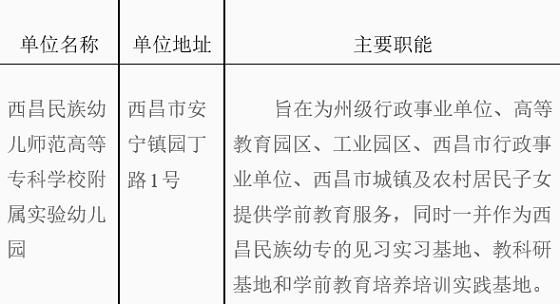西昌民族幼兒師范高等?茖W(xué)校附屬實(shí)驗(yàn)幼兒園系州教育和體育局所屬公益二類事業(yè)單位,是一所高起點(diǎn)規(guī)劃、高標(biāo)準(zhǔn)建設(shè)的高品質(zhì)示范幼兒園。為進(jìn)一步拓寬選人用人渠道,按照“公開(kāi)、公平、競(jìng)爭(zhēng)、擇優(yōu)”和人崗相適的原則,面向全州公開(kāi)考調(diào)附屬實(shí)驗(yàn)幼兒園教職工7名,現(xiàn)將相關(guān)事宜公告如下(本公告在涼山州人力資源和社會(huì)保障局官網(wǎng)人事考試專欄[http://rsj.lsz.gov.cn/]、涼山州教育和體育局官網(wǎng)http://jytyj.lsz.gov.cn/、西昌民族幼兒師范高等?茖W(xué)校網(wǎng)站http://www.xcmzyz.com/上發(fā)布)。