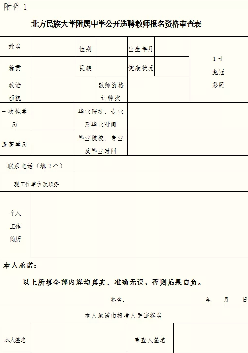 1、報(bào)名方式:有意應(yīng)聘者,請將個(gè)人應(yīng)聘材料以電子郵件的形式發(fā)送至北方民族大學(xué)附屬中學(xué)校辦公室。注意預(yù)留本人聯(lián)系方式,初選合格后,學(xué)校通知本人到校面試并進(jìn)行相關(guān)考核。