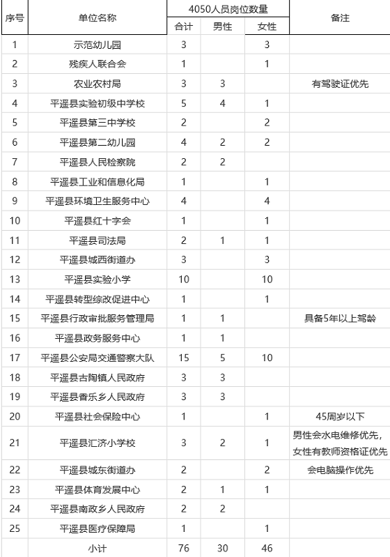 本次招用公益性崗位人員77名,其中:就業(yè)困難普通高校畢業(yè)生1名;用人單位:平遙縣人力資源和社會保障局,會計類專業(yè)。國有集體企業(yè)下崗失業(yè)就業(yè)困難人員(以下簡稱“4050”人員)76名,具體崗位(排名不分先后)如下: