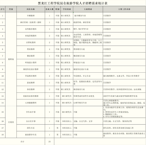 2.所學(xué)專業(yè)符合我校學(xué)科、專業(yè)建設(shè)需要,具有較高的業(yè)務(wù)素質(zhì),熱愛教育事業(yè),愿為黑龍江工程學(xué)院昆侖旅游學(xué)院的發(fā)展建設(shè)做出貢獻(xiàn)。