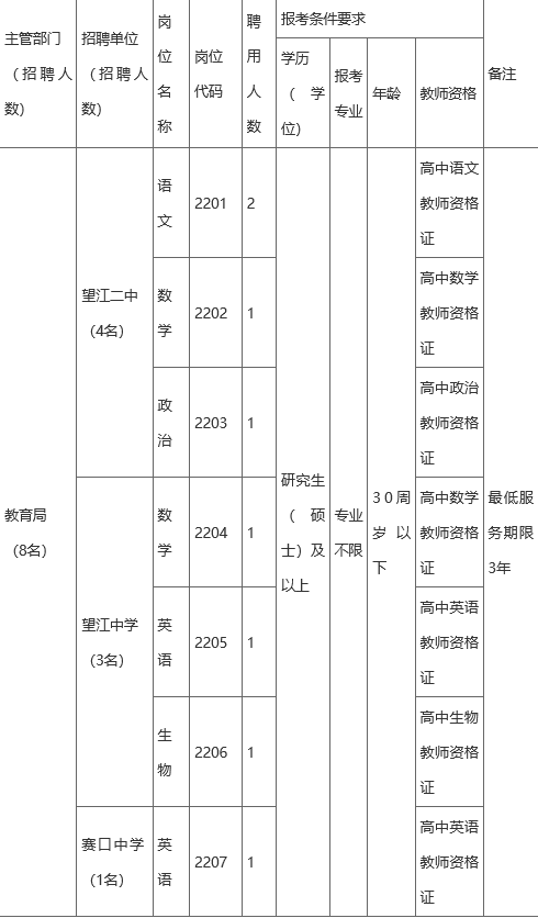 2022年望江縣赴高等院校公開招聘事業(yè)編制高中教師計(jì)劃8名。公告及其招聘計(jì)劃崗位信息于2月17日起同時(shí)在“安慶市人力資源和社會(huì)保障局網(wǎng)(http://rsj.anqing.gov.cn/)”、“望江縣人民政府網(wǎng)(http://www.wangjiang.gov.cn/)”、“望江縣人力資源和社會(huì)保障局信息公開網(wǎng)(http://www.wangjiang.gov.cn/public/column/19638133?type=4&action=list)”、“望江縣教育局信息公開網(wǎng)(http://www.wangjiang.gov.cn/public/column/19636906?type=4&action=list)”和相關(guān)高校招生就業(yè)網(wǎng)站上發(fā)布。