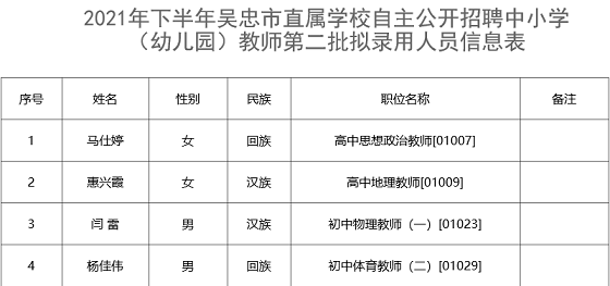 按照《寧夏回族自治區(qū)事業(yè)單位公開招聘工作人員實(shí)施辦法》和《2021年下半年吳忠市直屬學(xué)校自主公開招聘中小學(xué)(幼兒園)教師公告》有關(guān)規(guī)定,經(jīng)資格初審、筆試、復(fù)審、面試、體檢、考察等程序,擬聘用馬仕婷等考生為吳忠市直屬中小學(xué)校(幼兒園)教師,F(xiàn)予以公示,公示時(shí)間為2022年2月21日至2月25日(5個(gè)工作日)。