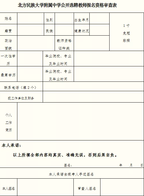 1、報(bào)名方式:有意應(yīng)聘者,請將個(gè)人應(yīng)聘材料以電子郵件的形式發(fā)送至北方民族大學(xué)附屬中學(xué)校辦公室。注意預(yù)留本人聯(lián)系方式,初選合格后,學(xué)校通知本人到校面試并進(jìn)行相關(guān)考核。