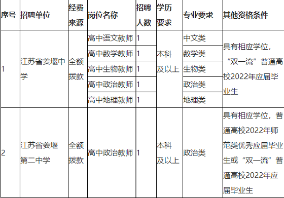 根據(jù)《2022年姜堰區(qū)部分高中校園公開招聘緊缺學(xué)科教師公告》安排,我區(qū)擬招聘全額撥款事業(yè)編制緊缺學(xué)科教師30名。我區(qū)前期進(jìn)行了公開招聘,已完成24名招聘計(jì)劃。近期我區(qū)將面向江蘇省外高校繼續(xù)招聘空余6名招聘計(jì)劃,招聘相關(guān)要求詳見《2022年姜堰區(qū)部分高中校園公開招聘緊缺學(xué)科教師公告》(http://www.jiangyan.gov.cn/art/2021/11/2/art_58428_3174494.html)。