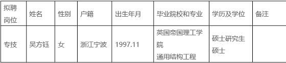 按照《寧波市事業(yè)單位公開招聘工作人員實(shí)施辦法》和《寧波市第二十三屆高洽會寧波開放大學(xué)公開招聘公告》(2021年9月29日)規(guī)定的程序,寧波開放大學(xué)公開招聘工作經(jīng)公開報名、統(tǒng)一考試,已進(jìn)入擇優(yōu)聘用程序。根據(jù)考試、體檢及考核結(jié)果,在符合條件人員中,經(jīng)學(xué)校領(lǐng)導(dǎo)班子集體研究,擇優(yōu)確定下列擬聘人員,現(xiàn)公示名單如下:
