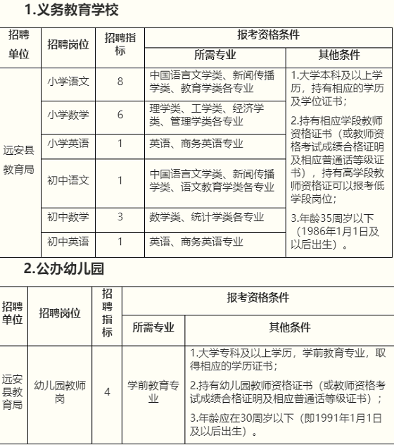 為充實教師隊伍,經(jīng)批準(zhǔn),遠(yuǎn)安縣教育局2022年擬面向社會公開招聘義務(wù)教育學(xué)校和公辦幼兒園教師24名,現(xiàn)公告如下: