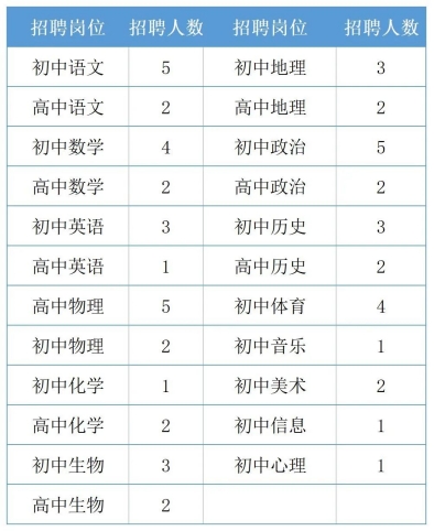 根據(jù)市政府辦學(xué)規(guī)劃,2022年學(xué)校繼續(xù)擴(kuò)大辦學(xué)規(guī)模,現(xiàn)面向全國招聘在職教師和優(yōu)秀應(yīng)屆畢業(yè)生58人。被錄用者納入公辦學(xué)校事業(yè)單位人員編制,工資福利待遇由市財政統(tǒng)發(fā),入職時間從2022年8月開始。奧賽優(yōu)秀教練員、骨干教師、學(xué)科帶頭人、名師、名班主任優(yōu)先聘用。招聘崗位計劃如下: