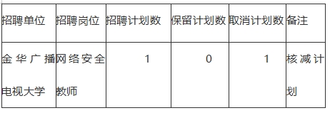 根據(jù)《2022年金華市教育局直屬學校公開招聘事業(yè)編制教師公告(16人)》中“繳費確認人數(shù)與招聘計劃數(shù)之比不足3:1的(部分緊缺崗位放寬至2:1,見附件1)崗位,將核減或取消招聘計劃。招聘計劃取消的報名人員,如符合其它崗位條件的,可自接到取消計劃通知起24小時內進行改報。逾期未改報的,視作放棄改報,退還考務費!钡囊(guī)定,經報名、資格審核和繳費,報考金華廣播電視大學網絡安全教師崗位未達到規(guī)定比例。根據(jù)公告規(guī)定予以核減,現(xiàn)將具體情況公示如下: