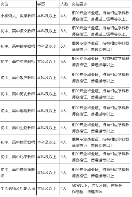 3.應(yīng)聘人員報名需提供:《應(yīng)聘登記表》、最近半年個人5分彩色證件照、應(yīng)聘人員承諾書、身份證、相應(yīng)學(xué)科教師資格證書、畢業(yè)證、學(xué)位證、等相關(guān)資料掃描件。(所有資料打包后以“應(yīng)聘崗位+姓名”命名發(fā)送至報名郵箱)
