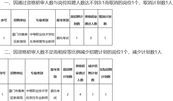 2022年集美區(qū)公開(kāi)招聘中小學(xué)幼兒園職業(yè)學(xué)校教師資格初審工作已于3月31日結(jié)束。根據(jù)《2022年廈門市公開(kāi)招聘中小學(xué)幼兒園職業(yè)學(xué)校教師公告》規(guī)定,資格初審?fù)ㄟ^(guò)的人數(shù)與崗位擬招聘人數(shù)比例不足3:1的,原則上相應(yīng)減少該崗位擬招聘人數(shù)或取消該招聘崗位。具體情況如下: