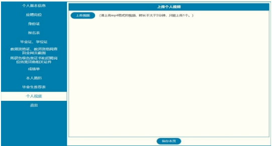 綜合評(píng)價(jià)滿分為100分,包括“基礎(chǔ)評(píng)分”滿分50分(根據(jù)考生上傳成績(jī)、榮譽(yù)等資料進(jìn)行打分)、“面談評(píng)分”滿分50分(考官根據(jù)考生上傳的答題視頻進(jìn)行打分)。面談?lì)}目:你認(rèn)為勝任報(bào)考崗位應(yīng)具備的能力有哪些?你已具備哪些?考生根據(jù)上述題目錄制2分鐘視頻,4月15日16:00前通過報(bào)名平臺(tái)http://jpjszp.fanedu.net上傳。視頻格式為mp4,大小不超過100MB,視頻只能上傳1個(gè)。上傳視頻可以在線預(yù)覽,如再次上傳,則替換原視頻。報(bào)名平臺(tái)界面如下: