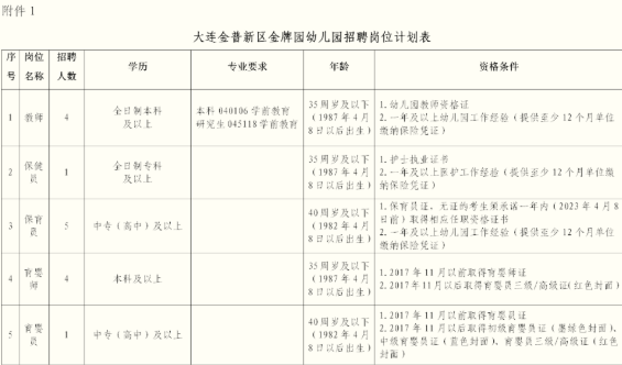 1.大連金普新區(qū)金牌園幼兒園招聘崗位計(jì)劃表