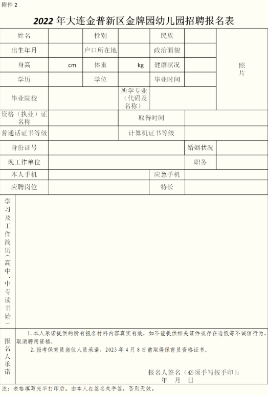 2.大連金普新區(qū)金牌園幼兒園招聘報(bào)名表