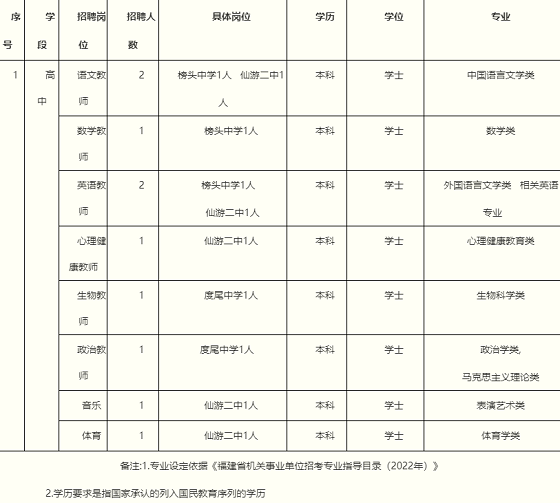 為吸引優(yōu)秀高校畢業(yè)生到我縣任教,建設(shè)高素質(zhì)教師隊(duì)伍,根據(jù)《福建省教育廳中共福建省委機(jī)構(gòu)編制委員會(huì)辦公室福建省財(cái)政廳福建省人力資源和社會(huì)保障廳印發(fā)<關(guān)于進(jìn)一步做好全省中小學(xué)幼兒園教師補(bǔ)充工作的若干措施>的通知》(閩教規(guī)[2022]3號(hào))精神,結(jié)合我縣實(shí)際,現(xiàn)就2022年莆田市仙游縣考核招聘中學(xué)新任教師方案公告如下: