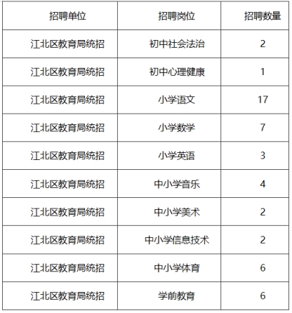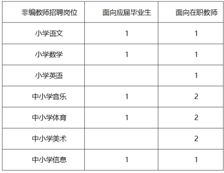 (六)本次事業(yè)編制教師招聘擬錄用人員公示期滿后,區(qū)教育局將發(fā)布非編教師招聘公告,本次入圍面試而未被錄用為事業(yè)編制教師的報(bào)考人員,在面試合格分以上,根據(jù)各招聘崗位總成績(jī)從高分到低分(放棄除外)確定為擬錄用非編教師人選。非編教師計(jì)劃招聘15名,具體招聘崗位、面向?qū)ο蠛蛿?shù)量如下: