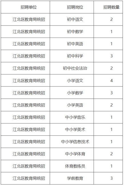 (3)體育教練員,直接填寫(xiě)附件4《江北區(qū)教育局公開(kāi)招聘事業(yè)編制優(yōu)秀教練員報(bào)名表》,把報(bào)名表、身份證、戶口本、學(xué)歷學(xué)位證書(shū)等符合報(bào)名條件的證明打包發(fā)送到j(luò)bjyxx@126.com。登記表照片,須近期免冠正面證件照,jpg格式,并與現(xiàn)場(chǎng)資格復(fù)審時(shí)提供的照片一致。