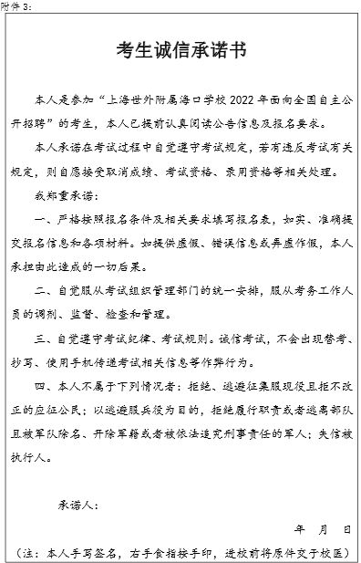 (4)法律、法規(guī)規(guī)定的其他不得報考的情形。應(yīng)聘者需提交誠信承諾書,我校將對擬錄用者通過“中國執(zhí)行信息公開網(wǎng)”等方式查證征信,在公開招聘任何階段(包括試用期)發(fā)現(xiàn)應(yīng)聘人員屬于上述失信懲戒人員的,一律取消聘用資格。