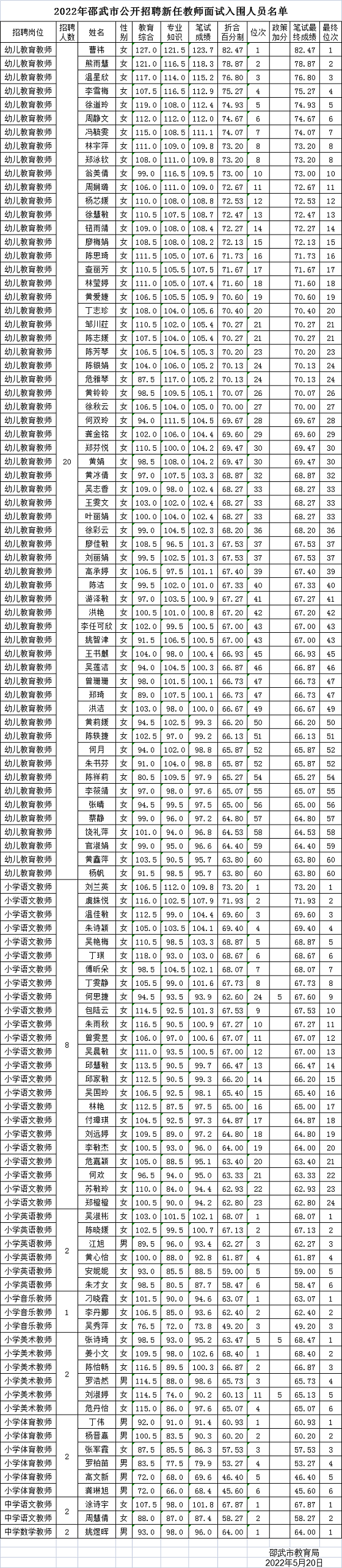 2022福建南平邵武市公開招聘新任教師面試入圍人員名單公告