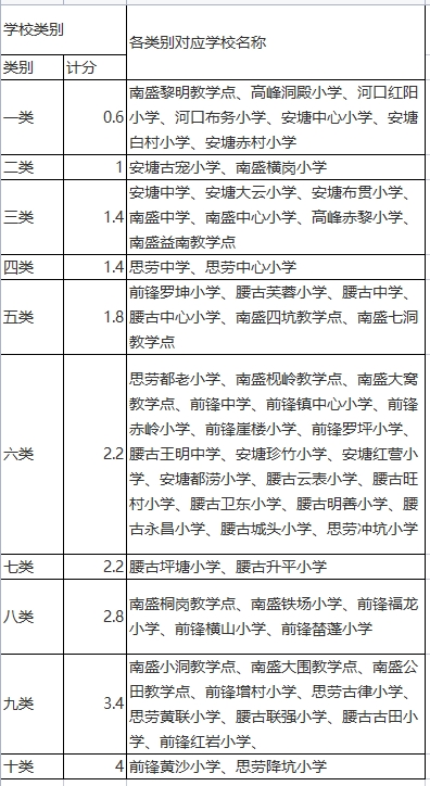 ⑶云城區(qū)邊遠(yuǎn)地區(qū)學(xué)校任教經(jīng)歷計(jì)分辦法。對(duì)不辭勞苦,服務(wù)我區(qū)邊遠(yuǎn)地區(qū)學(xué)校的支教教師,按《云城區(qū)邊遠(yuǎn)地區(qū)學(xué)校教師生活補(bǔ)助實(shí)施辦法》(云區(qū)財(cái)〔2017〕86號(hào))劃定的邊遠(yuǎn)地區(qū)學(xué)校類別進(jìn)行計(jì)分。各類學(xué)校量化計(jì)分見下表: