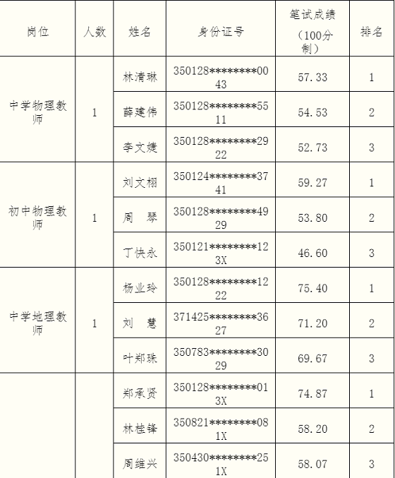 根據(jù)《2022年福建師范大學平潭附屬中學公開招聘教師方案》要求,按筆試成績從高分到低分,以擬招聘人數(shù)與進入面試人數(shù)1:3的比例確定資格復核和面試人選,F(xiàn)將參加面試資格審核人員名單及相關(guān)要求公布如下: