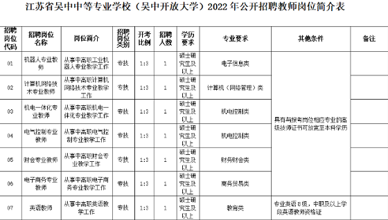 根據(jù)《江蘇省事業(yè)單位公開招聘人員辦法》(蘇辦發(fā)〔2020〕9號)和《省教育廳省人力資源和社會保障廳關于進一步做好全省中小學校新進教師公開招聘工作的意見》(蘇教規(guī)〔2016〕1號)有關規(guī)定,經(jīng)研究決定,2022年江蘇省吳中中等專業(yè)學校(吳中開放大學)面向社會公開招聘教師7名,招聘崗位納入事業(yè)單位編制管理。