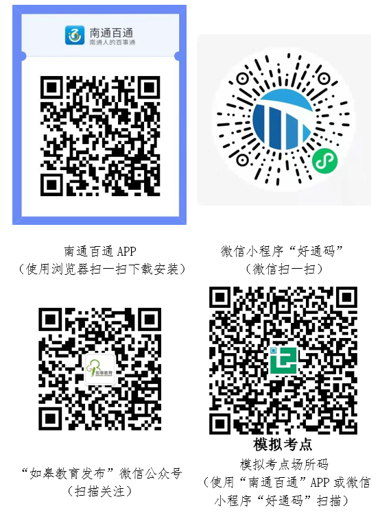 3.根據(jù)我市疫情防控要求,凡進(jìn)入公共場(chǎng)所,必須掃描該場(chǎng)所的二維碼,方可通行。因此,考生須在手機(jī)應(yīng)用市場(chǎng)中下載、注冊(cè)并實(shí)名認(rèn)證“南通百通”APP,點(diǎn)擊首頁(yè)上方的“蘇康碼”申領(lǐng)健康碼,然后在該健康碼下方“國(guó)務(wù)院行程卡查詢”右側(cè)“點(diǎn)擊驗(yàn)核”(建議參加考試前,每天點(diǎn)擊驗(yàn)核,一天一次,進(jìn)入考點(diǎn)當(dāng)天須提前點(diǎn)擊驗(yàn)核)。待進(jìn)入考點(diǎn)時(shí),打開(kāi)“南通百通”APP,在首頁(yè)點(diǎn)擊“掃碼核驗(yàn)”現(xiàn)場(chǎng)掃描“考點(diǎn)場(chǎng)所碼”,然后向考點(diǎn)工作人員出示掃描顯示結(jié)果。為避免影響考試進(jìn)程,提高考生進(jìn)場(chǎng)速度,建議考生及早完成下載“南通百通”APP、認(rèn)證等程序,并掃描文末“模擬考點(diǎn)場(chǎng)所碼”,查看是否能正常顯示健康碼、行程卡等信息。掃描“場(chǎng)所碼”,還可微信搜索小程序“好通碼”,實(shí)名認(rèn)證后點(diǎn)擊“掃一掃”進(jìn)行掃描。掃描前同樣需按以上辦法核驗(yàn)行程卡。