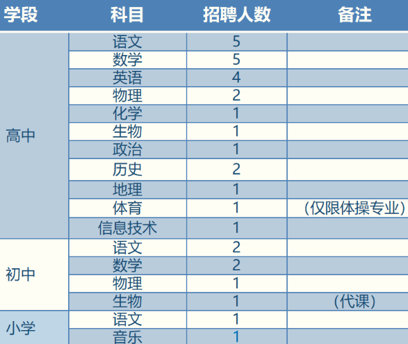 (6)語文、數(shù)學(xué)、英語、物理、歷史要求師范類專業(yè)畢業(yè),特別優(yōu)秀的非師范專業(yè)的名校畢業(yè)生可適當(dāng)考慮。