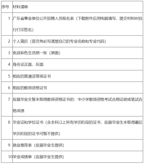 2.應聘人員填寫附件2:《廣東省事業(yè)單位公開招聘人員報名表》,個人簡歷,連同本人免冠彩色生活照(原圖)、身份證、普通話水平測試證書、教師資格證書(應屆畢業(yè)生暫未取得教師資格證書的提供中小學教師資格考試合格證明或筆試合格成績)、畢業(yè)證書、學位證書、就業(yè)推薦表、學業(yè)成績單及其他相關材料掃描成彩色電子版,并嚴格按下表材料清單順序把所有材料打包在同一個PDF文檔中,不按要求報名者一律不予受理。