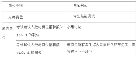 綜合素質(zhì)評(píng)估時(shí)間、地點(diǎn)以準(zhǔn)考證為準(zhǔn)。打印準(zhǔn)考證時(shí)間另行通知。根據(jù)疫情防控需要,綜合素質(zhì)評(píng)估采取線上或者線下的形式進(jìn)行。線下綜合素質(zhì)評(píng)估主要采取專業(yè)技能測試、小組討論等形式,對(duì)考生進(jìn)行考察。各崗位具體考核形式見下表。